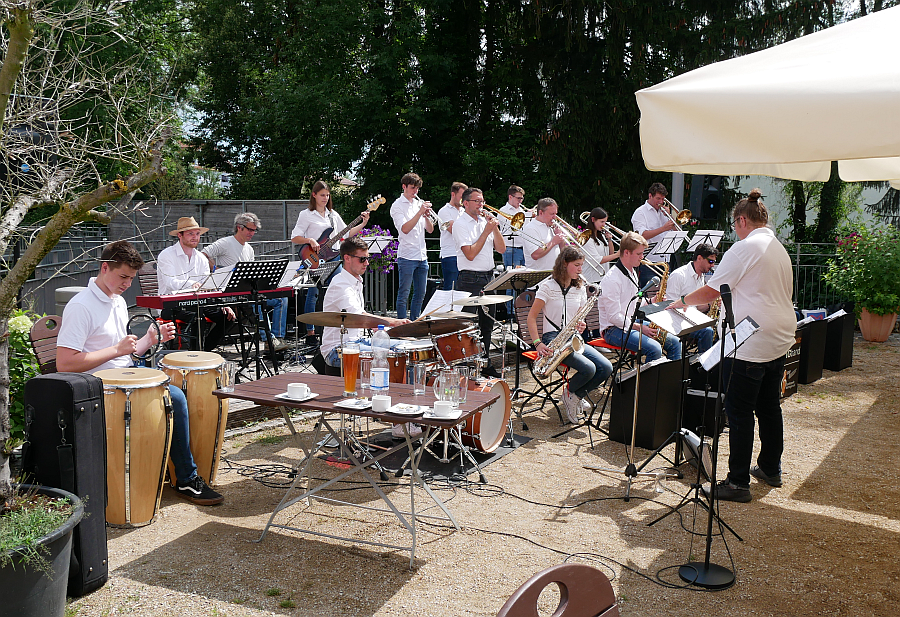 Bereits am vergangen Sonntag, den 25.07.21, startete die JazzTaste Bigband der Stadtkapelle Wertingen mit Bandleader Tobias Wiedenmann nach einer langen Coronazwangspause wieder voll durch. Trotz schlechter Wettervorhersagen konnte das Konzert mit nur einer kleinen Regenpause im Freien stattfinden. Unter anderem bezauberten Barbara Mayr und Tobias Wiedenmann die Zuhörer mit ihren Gesangstücken wie Moonglow, Girl from Ipanema, Diggin on James Brown, Long Train Running und vielem mehr. Vor allem eines der vielen Musik-Highlights wie „The Best of Earth, Wind and Fire“ sowie die zahlreichen Solisten der Bigband begeisterten das Publikum.