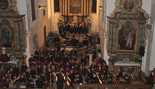 Die Stadtpfarrkirche war bis auf den letzten Stehplatz voll besetzt mit treuen Konzertbesuchern in Erwartung eines ergreifenden Konzerterlebnisses. Sie wurden nicht enttäuscht. Stadtpfarrer Rupert Ostermayer brachte die verschieden Werktitele in seinen Ansprachen unter einen großen Bogen zum Thema Engel, Schutzengel und die übertriebene Perfektion, der die Menschen oft hinterher rennen. Engel hätten auch andere Seiten und so waren die Musiker angetreten, auch andere Klänge des Himmels wiederzugeben.