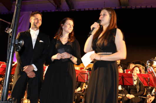 Am Ende des Konzerts entlud sich die geballte Energie des Schlagzeug- und Blechregisters im Stück „Incantation and Dance“ von John Barnes Chance, als sich bis zum fulminanten Schluss immer wilder und rasender Tanzrhythmen aufbauten. Wer von den Zuhörern der Meinung war, bereits das gesamte Spektrum an Emotionen gehört zu haben, wurde jetzt eines Besseren belehrt: Die Orchestervertreterinnen Franziska Mayr und Anna-Lena Neukirchner wandten sich nun direkt an ihren Dirigenten, um seine Arbeit zu würdigen und ihm an seinem letzten Osterkonzert für sein Engagement in Form eines Präsents zu danken. Dass dabei mehr als nur eine Träne floss, versteht sich von selbst. Insbesondere, als auf einer Leinwand die emotionalsten Momente der vergangenen Jahre in einer Präsentation von Stefan Buchele an Tobias Schmid vorbeizogen. Ganz ergriffen von der Überraschung seiner Musiker richtete der scheidende Dirigent gezielt Dankesworte an das Orchester, das Präsidium und last but not least an das Publikum, dessen Applaus natürlich die höchste Form der Anerkennung für jeden Musikanten darstellt.