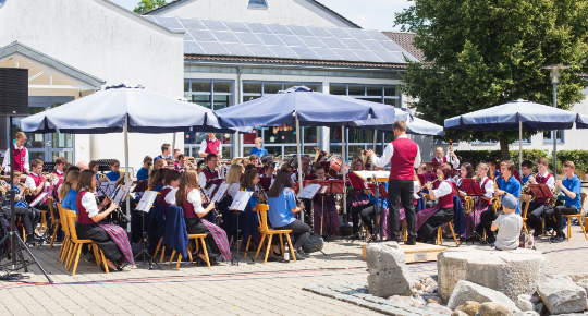 Zunächst überraschten die Musikerinnen und Musiker der Bläserphilharmonie unter der Leitung von Tobias Schmid die Gottesdienstbesucher der Stadtpfarrkirche mit einem Ständchen vor der Kirche und zogen dann gemeinsam mit dem Publikum hoch zur Grundschule, wo sich schon viele Zuhörer ein schattiges Plätzchen gesucht hatten.
