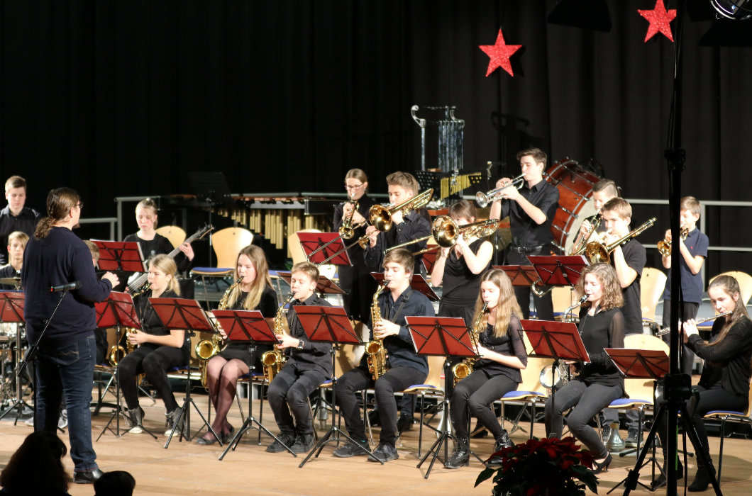 84 Musikerinnen und Musiker waren daran beteiligt und schafften es über zwei Stunden Konzert ihre Energie zu bündeln und in Spielfreude und Ausdruck zu verwandeln. Angeleitet von seiner Dirigentin Heike Mayr-Hof vertiefte sich das Jugendorchester in Musik aus dem 15. Und 18 Jahrhundert und zeigte seine kammermusikalischen und stilistisch ausgereiften Qualitäten bei Georg Friedrich Händels Feuerwerksmusik oder bei den Renaissancetänzen „Courtly Airs and Dances“ von Ron Nelson. Es war hörbar, dass es allen Beteiligten ein Anliegen war, den eigenen Ansprüchen und der Komposition gerecht zu werden. An Abwechslung mangelte es während des ganzen Konzerts nicht und so gab es neben originaler zeitgenössischer Blasmusik auch swingende Saxophonsolisten und weihnachtliche Arrangements. Das Orchester zeigte sich endlich auf einem ausgewogenen Niveau mit mutigen Solisten, tollen Teamplayern und vor allem begeisterungsfähigem Potential. Die Dirigentin war sichtlich zufrieden und kann die Probendisziplin und Konzentrationsfähigkeit der Jugendlichen nicht hoch genug einschätzen.